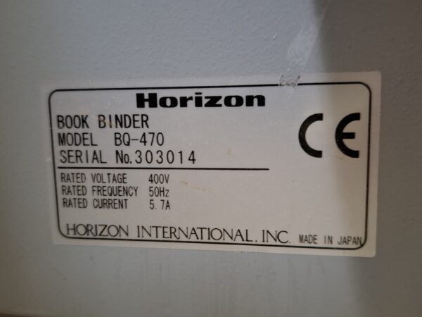 Fully Automated 4-Clamp Perfect Binder, Book Size: Max 320x320 mm, Min 145x105 mm, Cover Size: Max 320x660 mm, Min 135x225 mm, Book Thickness : 0,3 to 65 mm, Milling Depth Adjustment from 0 to 4 mm, Speed: 1,350 Books per hour Equipped with: Color Touchscreen panel, Horizon T-470 Weekly Timer, End-to-end Automated Set-up, EVA Tank Horizon MU-470EVA, Cover Feeder Suction, Additional Equipment: Extra PUR tank available upon request