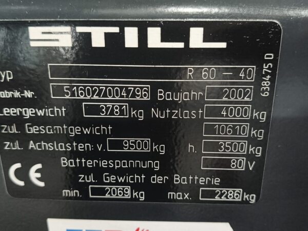 Still R 60-40Category: Forklift Typ/Art: Electric Forklift Manufacturer: Still Model: R 60-40 M-No.: O516027004796 Year of construction: 2002 Details: Capacity: 4000 KG Ref-NO.: fork-still-R-60-40-2002 Price on enquiry Request an offer Request on Whatsapp Share machine: share on Facebook share on Linkedin share at WhatsApp send Link as E-Mail Print this page: