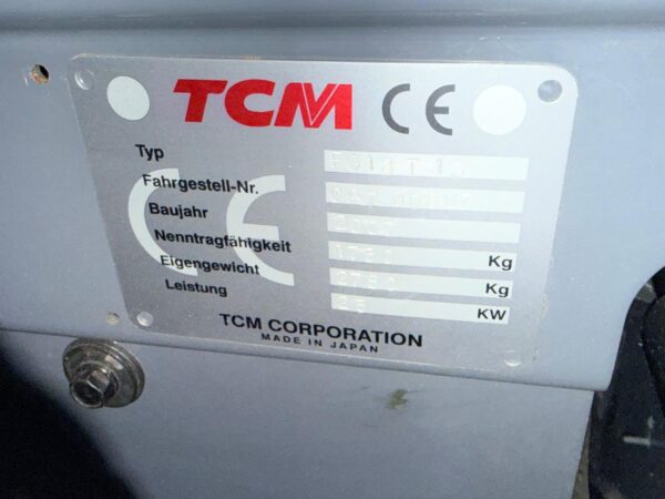 TCM FG18T13Category: Forklift Typ/Art: Forklift Manufacturer: TCM Model: FG18T13 M-No.: OA700807 Year of construction: 2007 Details: Mast: VFHM 435-0A7, Integral Sideshift, 1000mm Forks, Black Solid Tyres, LPG, Power: 25 KW, Own Weight: 2780 KG, Capacity: 1750 KG Ref-NO.: fork-TCM-FG18T13-2007 Price on enquiry Request an offer Request on Whatsapp Share machine: share on Facebook share on Linkedin share at WhatsApp send Link as E-Mail Print this page: