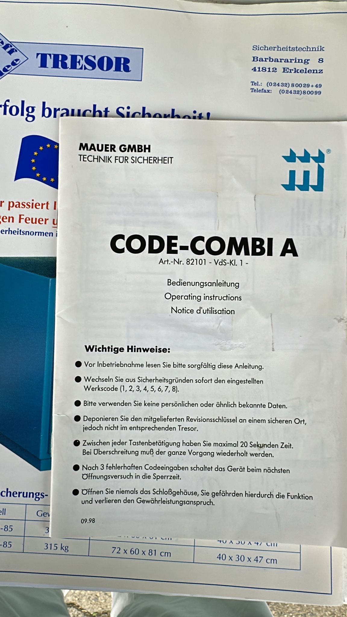 Mauer Tresor VdS/Kl. 1Category: Mores Typ/Art: Tresor Manufacturer: Mauer Tresor Model: VdS/Kl. 1 M-No.: 82101-VdS-Kl.1 Format: 72x60x81cm Details: Inner Dimensions: 40x30x74cm, Outer Dimensions: 72x60x81cm, EURO/VdS/Kl. 1, Weight: 310 KG. Ref-NO.: Mores-Mores-Tresor Price on enquiry Request an offer Request on Whatsapp Share machine: share on Facebook share on Linkedin share at WhatsApp send Link as E-Mail Print this page: